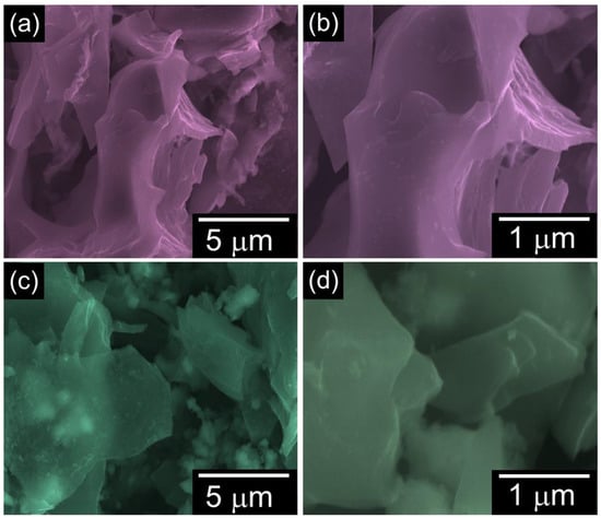 Figure 2. Low- and high-magnification FE-SEM images of (a,b) ELC-600 and (c,d) ELC-700 nanosheets.