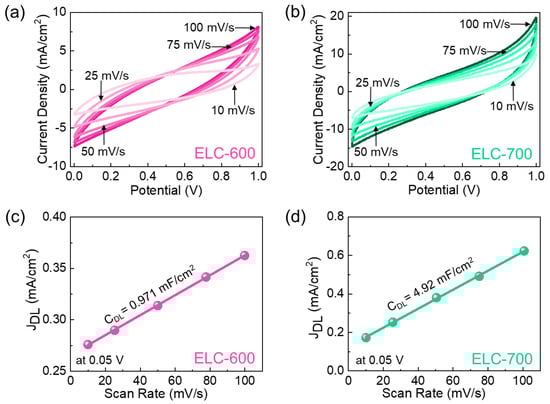 Figure 4. CV curves of the (a) ELC-600 and (b) ELC-700 catalysts. Non-Faradaic JDL at 0.05 V as a function of the scan rate of the (c) ELC-600 and the (d) ELC-700 catalysts.