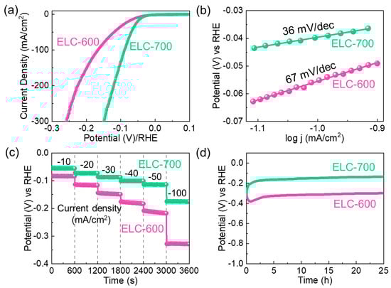 Figure 5. HER activities of the ELC-600 and ELC-700 catalysts. (a) iR-corrected LSV curves, (b) Tafel plots, (c) chronopotentiometric profiles at different current densities (−10 to −100 mA/cm2), and (d) long-term stability characteristics.