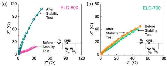 Figure 6. Nyquist plots of (a) ELC-600 and (b) ELC-700 catalysts before and after the stability test (Inset in the equivalent circuit of the active catalysts).