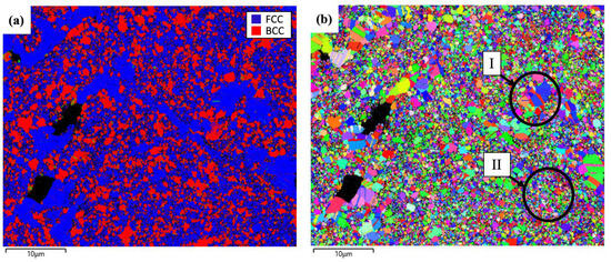 Figure 2b displays the EBSD orientation map of the alloy. It reveals that the alloy demonstrates a variety of grain sizes, morphologies, and orientations. The heterogeneity of the alloy is a characteristic feature of dual-phase structured materials. It is evident that the FCC phase contains grains with twinned structures, particularly within the larger grains (see position “I” in Figure 2b). The observed twinning behavior suggests the presence of deformation that is characteristic of ductile FCC alloys with low stacking fault energy [27], contributing to a good balance between the strength and ductility of the alloys. Additionally, the smaller grains of the FCC matrix phase exhibit a nanostructure, with grain sizes approaching ~200 nm (see position “II” in Figure 2b). The fine-grained structure is a result of severe plastic deformation during mechanical alloying, which enhances the strength of the alloy.