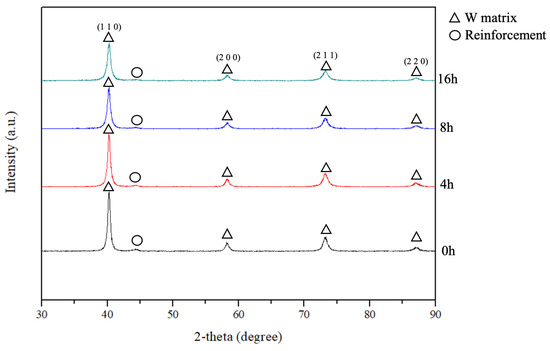 Figure 4 shows the XRD patterns of the W-Al alloy powders at different milling durations. The main peaks correspond to the tungsten matrix, associated with the (110), (200), (211), and (220) planes, and remain dominant throughout the milling process. The broadening of tungsten peaks and the reduction in their intensities with increased milling time are attributed to the introduction of crystal defects and lattice strain in tungsten, arising from collision events during ball milling. A weak peak at a 2-theta angle of approximately 43° is observed, which corresponds to the presence of the reinforcement phase (AlCoCrFeNi2.1). As the milling time increases, the reinforcement phase increasingly interacts with the tungsten matrix phase, leading to the gradual formation of a partial solid solution. The milling process further contributes to peak broadening as the atomic lattice becomes more disordered due to the dissolution of the reinforcement phase atoms into the tungsten matrix.