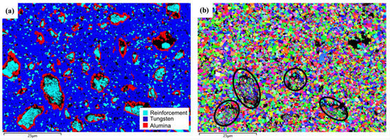 Figure 6 presents the EBSD analysis of the W-Al model alloy. The EBSD phase map in Figure 6a reveals three distinct phases in the microstructure. The tungsten matrix is identified by blue regions. The AlCoCrFeNi2.1 reinforcement phases appear as light blue areas and are confirmed to have an FCC structure. Al-rich oxides are marked in red and tend to form around larger reinforcement particles. The tungsten matrix is the primary phase, constituting 63.7% of the volume fraction, followed by the AlCoCrFeNi2.1 reinforcement phase (12.5%) and alumina phase (9.63%). The reinforcement phases show a nonuniform distribution, with larger particles (5~15 um) surrounded by (Al,Cr) oxide layers and smaller particles (~1 um) dispersed more uniformly within the tungsten matrix. The different distribution phenomenon suggests that the formation and growth of the reinforcement phase are influenced by diffusion kinetics and interfacial reactions. In this case, aluminum depletion from the reinforcement phase instead leads to the formation of (Al,Cr) oxide layers around larger reinforcement particles. This depletion can hinder the formation of the AlNi BCC phase, which is typically observed in AlCoCrFeNi alloys.