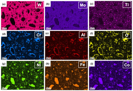 EBSD-EDS mapping of the W-Al model alloy: (a) W map, (b) Mo map, (c) Ti map, (d) Cr map, (e) Al map, (f) O map, (g) Ni map, (h) Fe map, and (i) Co map.