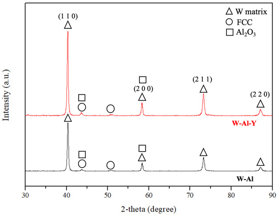 Figure 11 shows the bulk XRD patterns of the tungsten model alloys (W-Al and W-Al-Y), revealing strong peaks corresponding to the tungsten matrix. These peaks are associated with the (110), (200), (211), and (220) planes of the tungsten crystal structure. The FCC reinforcement phase is also observed in the XRD patterns of the tungsten model alloys, as indicated by the weak peaks at 2θ angles of approximately 43° and 51°, corresponding to the (111) and (200) planes of the AlCoCrFeNi2.1 alloy, respectively. It should be noted that the Al2O3 phase was also detected at around 2-theta ~43°, overlapping with the FCC reinforcement phase. On the other hand, the XRD pattern of the W-Al-Y model alloy shows an increase in peak intensity. The phenomenon may be related to grain refinement and improved homogeneity in the alloy, attributed to the dispersion of Y2O3 particles, which contribute to the stabilization and refinement of the microstructure.