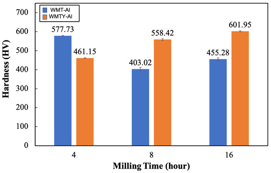 Figure 12 shows the Vickers hardness of tungsten model alloys (W-Al and W-Al-Y) at various ball milling times. At 4 h of milling, the W-Al alloy exhibits a higher hardness (577.73 HV) compared to the W-Al-Y alloy (461.15 HV). The higher hardness in W-Al can be attributed to the finer grain structure of the reinforcement phase, which is not agglomerated at this stage. In contrast, the W-Al-Y alloy exhibits lower hardness due to the formation of (Al,Cr) oxides around larger reinforcement phases. These oxide layers act as weak interfaces, reducing the bonding strength between the reinforcement and the matrix. After 8 h of milling, there is a significant drop in the hardness of W-Al (403.02 HV). It suggests that the agglomeration of reinforcement phases with the surrounding (Al,Cr) oxides can impact the hardness of alloys. Meanwhile, W-Al-Y shows an increase in hardness to 558.42 HV in this stage due to a more even distribution of reinforcement phases without excessive clustering. At the final stage of milling, the W-Al alloy has continued growth of large reinforcement phases and the development of a thicker (Al,Cr) oxide layer surrounding them, resulting in a further decrease in hardness to 455.28 HV. However, the hardness of W-Al-Y increases significantly to 601.95 HV, indicating that prolonged milling has led to further refinement of the reinforcement phases and the dispersion of small oxide particles throughout the tungsten matrix. The microstructural refinement and uniform dispersion contribute to the improved hardness of W-Al-Y at this stage.