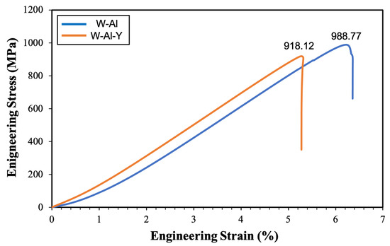 Figure 13 shows the compressive stress–strain curves of the W-Al and W-Al-Y model alloys. Both model alloys exhibit a compressive stress of approximately 950 MPa and a compressive strain of about 6%, indicating their brittleness and limited capacity for plastic deformation. In this study, the brittleness of materials can be attributed to the following two points. Firstly, the (Al,Cr) oxide layer surrounding the reinforcement phases significantly affects the mechanical properties. The (Al,Cr) oxide layer may weaken the interfacial bonding of the alloys by introducing brittle regions, which can serve as initiation points for crack formation and propagation under stress. The oxide layer also acts as a brittle barrier around the reinforcement phases, impeding plastic deformation through dislocation movement and consequently reducing ductility. Secondly, the (Al,Cr) oxide layers also have weak interfaces and limited load transfer capabilities. These layers hinder effective load transfer between the reinforcement and the matrix, preventing the reinforcement phases from fully contributing to the alloy’s strengthening. Consequently, the alloy reveals reduced compressive strength and an increased tendency for brittle fracture.