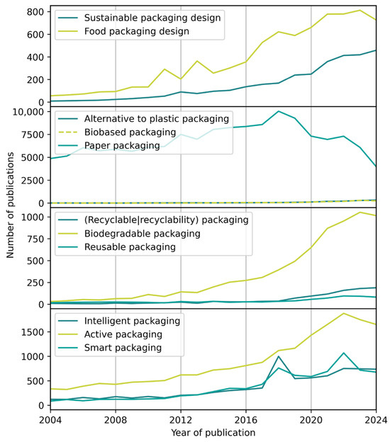 Finally, searches for “Intelligent packaging”, “Active packaging”, and “Smart packaging” were included to account for innovative features in these regards. The research output for all three terms has been increasing over the last twenty years, with more publications on active packaging than on intelligent or smart packaging.