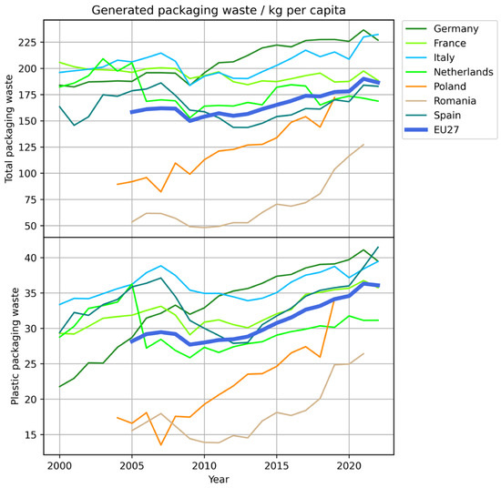 Figure 2. The generated total (top) and plastic (bottom) packaging waste in kg per capita across the EU and selected member states from 2000 to 2022. The countries selected each have a population of more than 15 million and comprise 74% of the total population of the EU. The figure was generated from Eurostat data [30].