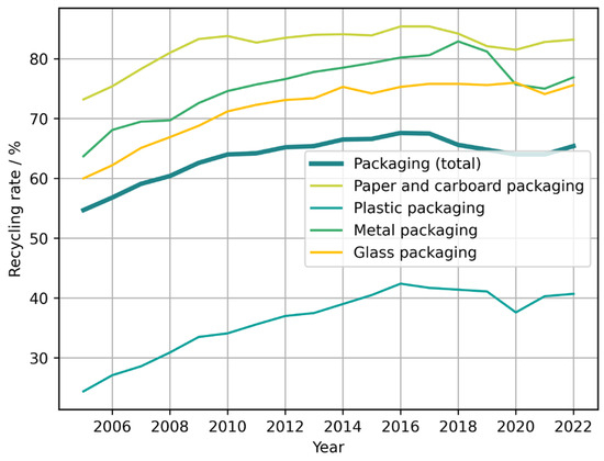 According to Eurostat, inhabitants of the EU generated around 190 kg per capita of total packaging waste (for all materials and types of packaged goods) in 2022, with strong variations among the different countries contributing to the statistics [30]. The amount of generated packaging waste has generally increased over the last 20 years (cf. Figure 2). The generated plastic packaging waste amounts to approximately 36 kg per capita, or less of a fifth of the total packaging waste by mass. Since plastic packaging is lighter than most other forms and the total packaging encompasses transport packaging as well, the role of plastic packaging is clearly significant. As shown in Figure 3, the recycling rate for plastic packaging, though improved in the last 20 years, is also lower than that for other types of packaging materials, which exacerbates its impact after disposal [31]. Again, this figure encompasses packaging for any use, not just food.