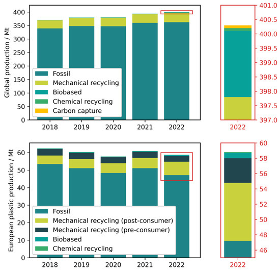 Figure 4. Global (top) and European (EU27+3, (bottom)) plastics production by feedstock. The right inset highlights the smaller contributors for 2022. The figure was generated from data published in the fast Facts by Plastics Europe [32].