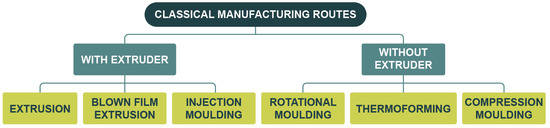 This type of material can be processed into the different formats required for the specific needs of food packaging, mainly films, trays, jars, or bottles. As a result, there are various production routes and equipment available on the market, designed to provide a good mix of materials and the appropriate shape. However, stricter regulations and more environmentally conscious consumer demands are gradually replacing oil-based plastics with more sustainable alternatives. The latter can be biobased, biodegradable, or have a high recycled content. Nevertheless, they are generally more expensive, more sensitive to the processing conditions, and have lower technical performance [10].