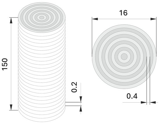 FDM printing profoundly transforms filament symmetry into a centripetal-lamellar structure. The billets were printed layer by layer with the axis perpendicular to the support plate. Each layer, 0.2 mm thick, was printed by fusing concentric circles of diameters diminishing to a spot in the center of the billets—as schematically shown in Figure 1.