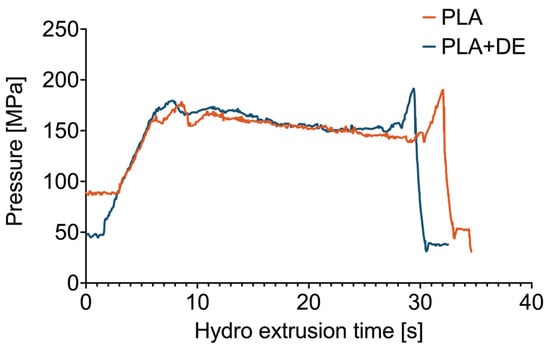 The initial increase in pressure is related to the need to overcome frictional forces on the shaping die. Further along in the deformation process, the pressure stabilizes. Minor pressure oscillations may be related to thermal effects occurring in the deformation zone, resulting in the observed character of the product surfaces. A comparison of pressure runs for the two materials, PLA and a PLA+DE composite, show no significant differences in the strengthening during plastic processing. In contrast, the differences between the samples would signalize differences in the strain and deformation of the samples [29]. Here, the true strain was the same for both kinds.