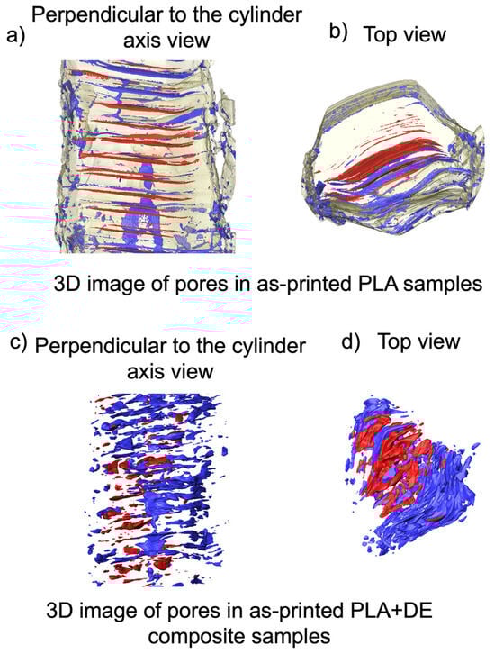 Reconstruction of the porosity for as-printed billets based on the data obtained from the micro-CT. (a,b)—as-printed PLA 3D samples; (c,d)—as-printed PLA+DE 3D samples. The color marking corresponds to the porosity type. Open pores are marked blue, while the closed pores are marked red.
