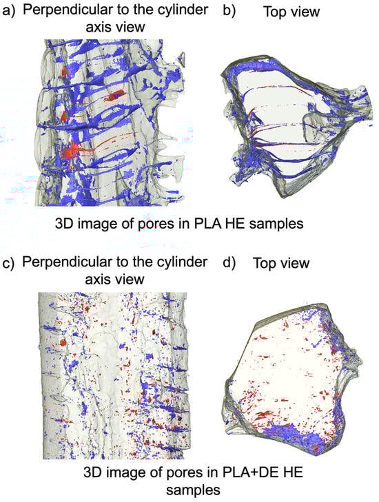 Reconstruction of the porosity for HE post-processed billets based on the data obtained from the micro-CT. (a,b)—PLA 3D HE samples; (c,d)—PLA+DE 3D HE samples. The color marking corresponds to the porosity type. Open pores are marked blue, while the closed pores are marked red.
