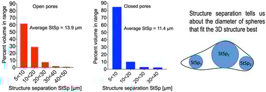 Based on the results of X-ray CT, the size of pores has been determined using the parameter explained in Figure 5, which also shows experimental size distribution for open and closed pores in PLA after hydro-extrusion. The average values of the Structural Size Parameter (StSp) are listed in Table 2.