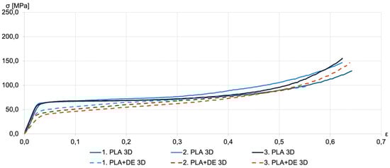 Representative compression stress–strain curves for PLA 3D (solid lines) and PLA+DE 3D as-printed samples (dashed lines). The multiple lines shown in the figure for each kind correspond to repeated measurements.