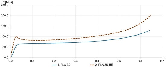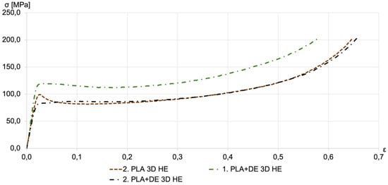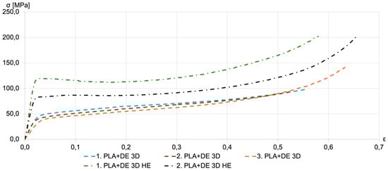 Stress–strain curves for the 3D-printed PLA with DE (PLA+DE 3D) samples, both before and after HE, are shown in Figure 8. HE treatment significantly enhanced the compressive strength of the samples. Notably, the HE-treated PLA+DE samples also demonstrated substantial improvements in compressive strength compared to those without DE. Despite the relatively large starter of the measurement results, the compressive strength of HE-treated PLA+DE samples ranged between 80 and 120 MPa.