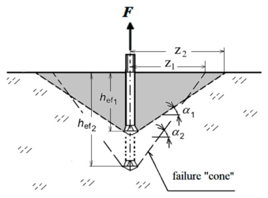 In later studies, it was assumed that the destruction zone could be described as a cone, but with an angle α = 37.5° (Linear Fracture Mechanics Method—LEFM [27]) or 35° (Concrete Capacity Design Method—CCD [46]). According to the CCD method, this angle is determined at the point when the pull-out force on the anchor reaches its maximum value, corresponding to a point on the trajectory located approximately at a depth of ~0.45 hef [43].