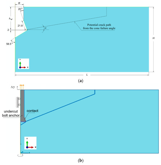 Axially symmetric model of rock medium: (a) dimensions of rock model with undercut for anchor; R—radius of cylindrical part of anchor; hef—effective depth of anchorage; H, L—dimensions of rock medium model; α—angle of potential crack propagation (potential destruction cone); (b) “contact”—contact zone between rock and conical part of anchor head; Δy—displacement forcing of anchor.