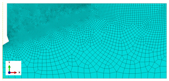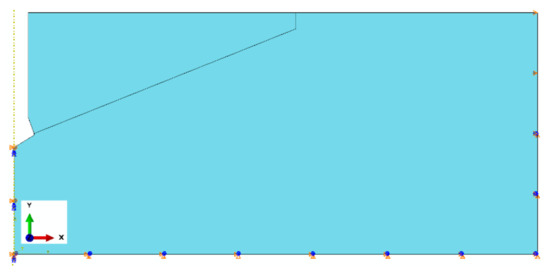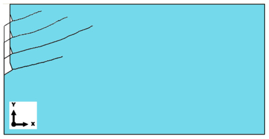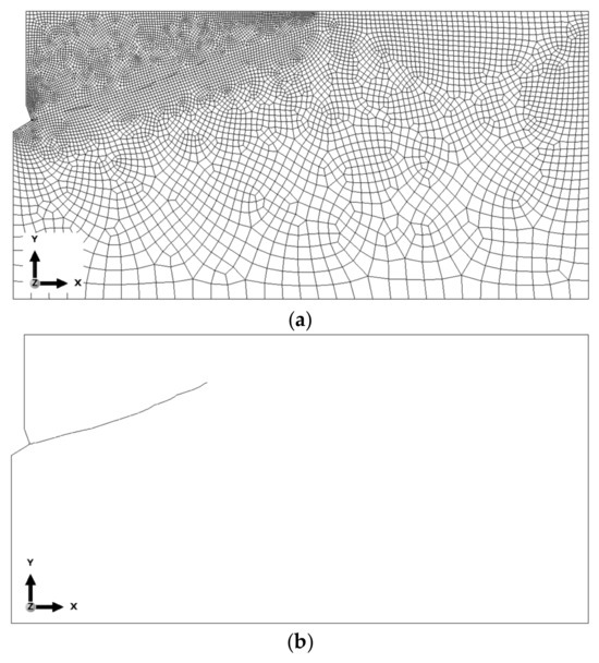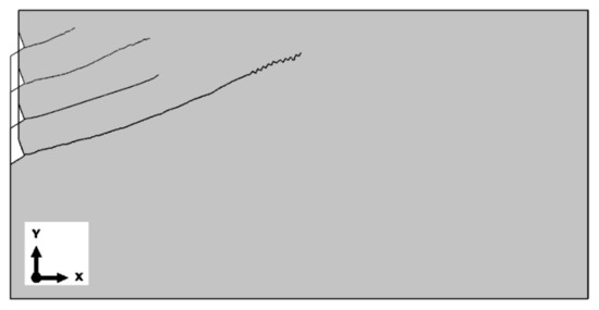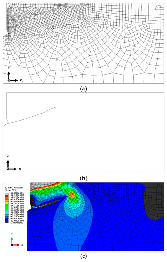 Based on the results of the sensitivity analysis, the most suitable mesh was determined to be the one proposed as the “base mesh” (Figure 4a). This mesh satisfactorily represents the crack propagation trajectory (a smooth trajectory without “jagged” steps, as shown in Figure 6c) while significantly reducing the computational time required for the algorithm to complete.