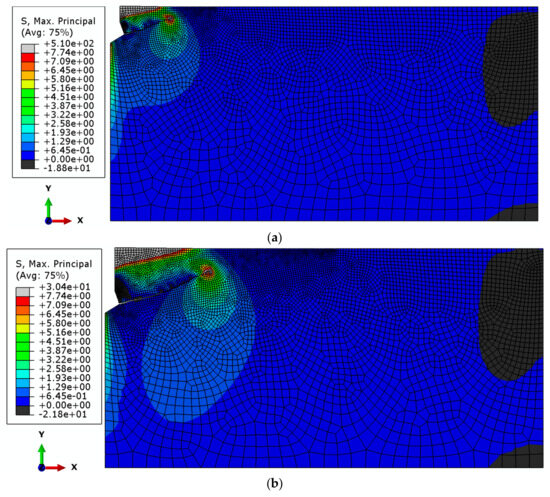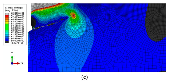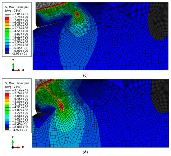 The maximum tensile stress occurs at the crack tip (red color) and corresponds to the tensile strength of the rock medium, ft = 7.74 MPa. The gray color (at the crack tip) indicates a higher value resulting from the approximation of tensile stresses σmax exceeding this value, which in turn stems from the tolerance settings in the ABAQUS software and the automatic discretization of the obtained stress range into bands visible on the stress maps. The black band of compressive stresses observed in the lower right corner may result from the local distribution of geometric parameters describing the geometry of the rock model and the anchor at a given anchoring depth. Similar effects have been observed in other studies [52].