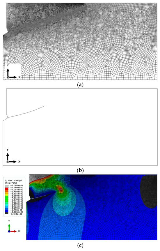 Figure 4. Results of the analysis conducted for the base mesh: (a) base mesh model, (b) obtained crack propagation trajectory, and (c) distribution of maximum principal stresses σmax near the anchor head and crack tip.