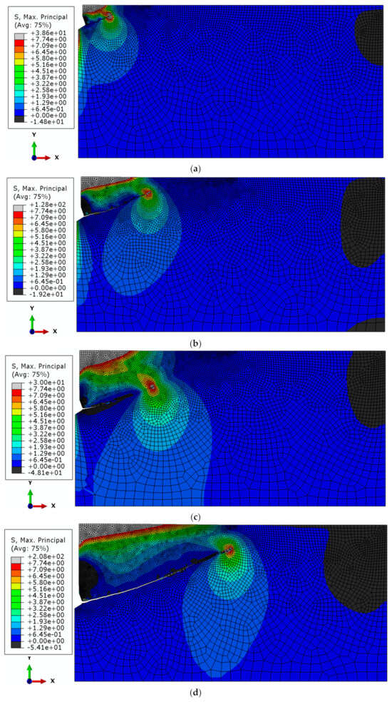Destruction model (according to ABAQUS procedure)—Max Principal Stress: In order to simulate crack propagation under linear elastic conditions, the crack path direction must be determined. There are several methods used to predict the direction of crack trajectory such as the maximum tangential stress theory (or the maximum circumferential stress theory), the minimum strain energy density theory and the maximum energy release rate criterion based on Griffith’s theory.