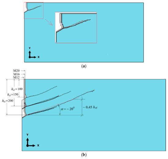 - Karmokar, T.; Mohyeddin, A.; Lee, J.; Paraskeva, T. Concrete Cone Failure of Single Cast-in Anchors under Tensile Loading—A Literature Review. Eng. Struct. 2021, 243, 112615. [Google Scholar] [CrossRef]