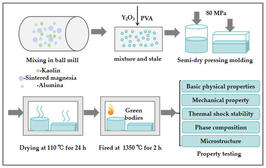 The cordierite–mullite composite ceramics were prepared following the process shown in Figure 1. The detailed preparation procedure is outlined as follows.