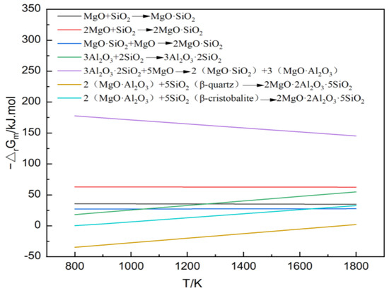 The sintering temperature has a significantly greater impact on the free energy of a reaction compared to the reactant concentration and partial pressure. Therefore, the relationship between temperature and the free energy of a standard reaction can be visually represented through thermodynamic calculations. In this study, the cordierite and mullite phases were formed via in situ solid-state reactions between alumina (Al₂O₃), silica (SiO₂), and magnesia (MgO) in the raw materials. The theoretical Gibbs energies of each reaction were calculated over the temperature range of 800K to 1800K. The calculated results were then plotted as a linear function to illustrate the relationship between the theoretical Gibbs free energies (△rGm) and temperature (T). The main chemical reactions in the MgO-Al2O3-SiO2 ternary system, along with their thermodynamic calculation results and temperature variation trends, are shown in Figure 2.