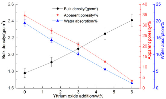 Impact of yttrium oxide addition on the bulk density, apparent porosity, and water absorption of the samples.