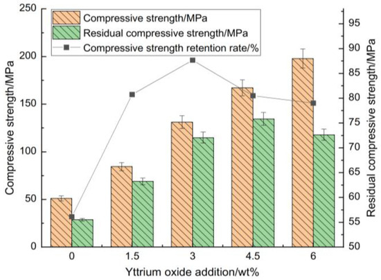 Impact of yttrium oxide addition on the room-temperature compressive strength, thermal shock residual strength, and strength retention rate of the samples.