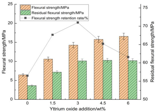 Impact of yttrium oxide addition on the room-temperature flexural strength, thermal shock residual strength, and strength retention rate of the samples.