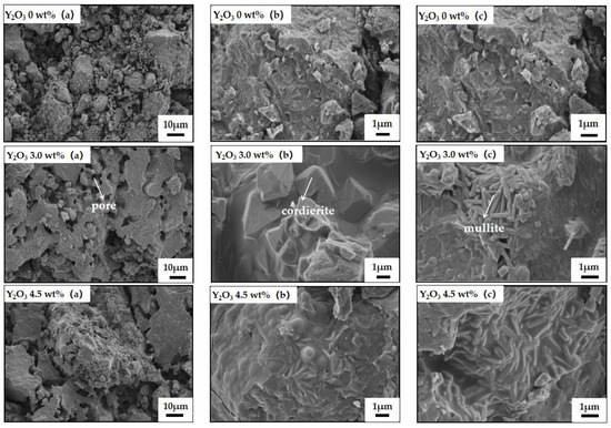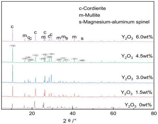 As illustrated in Figure 6, the analysis revealed that, with increasing additions of yttrium oxide, the peak intensity of the cordierite phase initially increased and subsequently decreased. This suggests that the addition of yttrium oxide promoted the formation of cordierite and mullite phases to a certain extent. However, excessive yttrium oxide reduced the peak intensity of the cordierite phase. This effect is ascribed to the ionic radius of Y3+ in yttrium oxide being comparable to that of Mg2+ in the raw materials, allowing Y3+ to partially substitute Mg2+, thus causing lattice distortion and the rearrangement of lattice particles. This weakened the bonding force between particles and activated the lattice. Furthermore, the addition of yttrium oxide generated a high-temperature liquid phase within the sample, which moderately heightened the ion migration rate. The solid–gas interface with lower surface tension was replaced by a liquid–gas interface with a higher surface tension, thereby accelerating the solid-phase reactions between ions and promoting the synthesis of the cordierite and mullite phases. However, an excessive liquid phase could partially decompose the cordierite phase, reducing its peak content.
