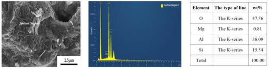 Based on the energy spectrum analysis results presented in Figure 8, it is evident that, at a sintering temperature of 1350 °C, the introduction of a specific quantity of yttrium oxide as a sintering additive leads to the formation of a columnar phase with a significantly larger growth diameter. The compositional analysis via energy spectrum indicates that the composition of this columnar phase (O: 48.83 wt%, Al: 38.03 wt%, Si: 13.14 wt%) closely aligns with the theoretical composition of mullite, thereby confirming that the elongated columnar phase formed in the sample is indeed the mullite phase.
