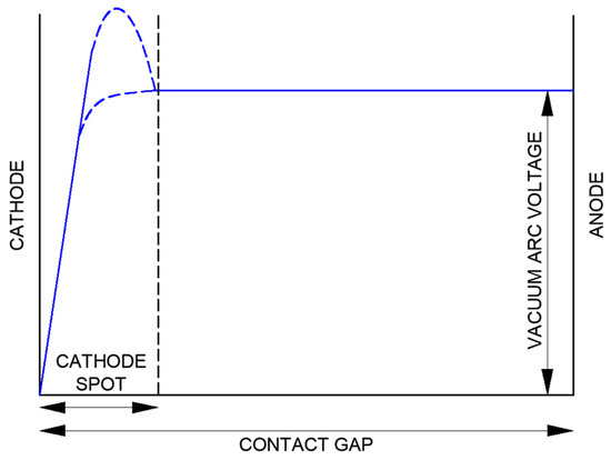 At first glance, the plasma above the cathode spot in the interelectrode space appears diffuse, faintly luminous, and neutral, serving only to conduct arc current from the anode to the cathode. In this arrangement, the anode acts as a passive electron collector. However, a closer examination reveals that the physical processes occurring in the plasma significantly influence the nature of the discharge. For small contact gaps of 2 mm or less, almost the entire voltage drop is concentrated at the cathode spot, with virtually none occurring within the plasma itself. This phenomenon is illustrated in Figure 2. For large-diameter contacts, typical of vacuum interrupters, the total voltage of the dissipated vacuum arc typically ranges from approximately 20 V to 45 V, with currents up to 3150 A and a standard contact gap ranging from 8 mm to 20 mm.