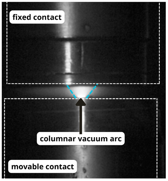 High-current vacuum arc behavior has been analyzed in various studies [1,13]. Using photographic analysis, researchers have described the behavior of the vacuum arc in vacuum interrupters. This process is typically recorded using high-speed cameras. By measuring the contact gap in each frame, researchers can track arc duration and correlate the onset of the arc with voltage changes. The first visible bright spot indicates the moment of arc ignition, allowing for the association of individual frames with arc-related phenomena, such as voltage fluctuations, current changes, and contact gap evolution.