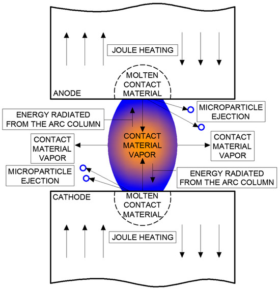 Studies [7,8] have shown that most material loss results from the emission of contact material particles, likely due to the rapid formation and movement of cathode spots across the cathode surface [9,10]. The emitted metal particles, ranging in diameter from fractions of a micrometer to tens of micrometers, travel at velocities of 10 to 800 m/s and reach temperatures higher than the melting point but below the boiling point of the cathode material