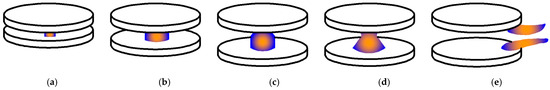Modes of the formation of high-current vacuum arc for butt contacts (own development): (a) the bridge column arc, (b) the diffuse column arc, (c) the constricted column vacuum arc, (d) the plasma jet column vacuum arc, and (e) the anode and cathode jet vacuum arc.