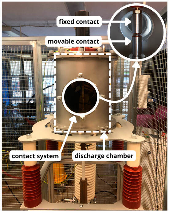 The test stand used in this study is part of the equipment in the Faculty Laboratory of Switching and Distribution Equipment at the Faculty of Electrical Engineering and Computer Science, Lublin University of Technology. The core of the laboratory setup is a demountable vacuum chamber equipped with a contact system mounted inside. This setup enables precise measurement of arc parameters during switching operations. The chamber is operated by an electromagnetic drive, adapted from a medium-voltage circuit breaker, which works in conjunction with a dedicated bay controller. The bay controller allows for precise opening and closing of the contact system. The vacuum chamber is equipped with special sight glasses at the contact height, enabling observation of the contact system during testing. A view of the discharge chamber with the mounted contact system is shown in Figure 6.