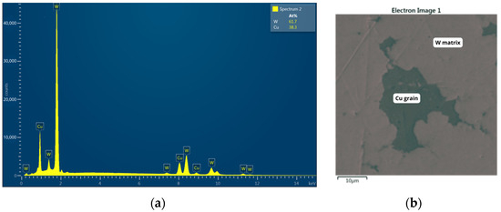 SEM imaging was obtained using a scanning electron microscope system working in a high vacuum regime equipped with a scintillator YAG secondary electron detector. One can see a highly irregular Cu grain of approximately 40 um x 30 um in size, with several axon-shaped appendices of length ~10 um in the W matrix. EDS microanalysis performed using an EDS advanced system with a 10 mm2 X-act SSD silicon detector confirmed the general composition of the material, based on several characteristic X-ray lines of W and Cu, shown in EDS spectra. Any important impurities (with a concentration higher than 0.1 weight %) were not detected. However, one should have in mind that composition determined by an automated system should be taken cum grano salis as it may vary with the position of the optical axis in the case of such highly inhomogeneous (in three dimensions) material.