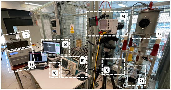 View of the laboratory station used to test switching operations: 1—discharge chamber with the contact system, 2—electromagnetic drive, 3—pre-pump, 4—ultrafast camera, 5—oscilloscope, 6—computer workstation, 7—autotransformer, 8—electronic load cell, and 9—delay controller and “zero-crossing” detector.