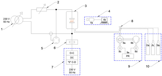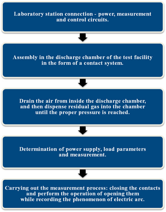 Once the system was properly connected, the key issue was to assemble it in the discharge chamber of the test facility in the form of a contact system. Using a vacuum kit, air was pumped out of the interior of the discharge chamber, and then, using appropriate valves, residual gas in the form of helium was dispensed into the chamber. After the vacuum chamber was pressurized, the supply and load parameters were determined. Then, the measurement system—an oscilloscope and an ultrafast camera—was put into operation. In order to correctly record the vacuum arc phenomenon, it was crucial to properly set up the camera and illumination and determine the appropriate camera parameters. Then, the contact system was closed, the load was attached, and the contact system was opened. Just before opening the contacts, it was necessary to start recording, which was saved on a computer disk for later analysis. A block diagram showing the methodology for performing measurements of selected parameters of an electric arc in a vacuum discharge chamber is shown in Figure 9, while an electrical diagram is shown in Figure 10.