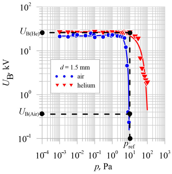 Characteristics of UB = f(p) for a vacuum interrupter with vacuum generated based on air and helium for a contact gap of d = 1.5 mm [3].