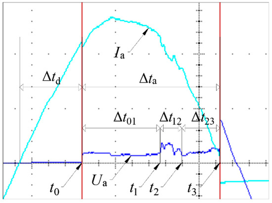 Characteristics of current and voltage during the arc burning process at a pressure equal to pref = 1.00 × 101 Pa: Ia—the value of the electric current flowing through the contact system, Ua—the voltage of the vacuum arc, Δtd—the delay time after which the arc ignited, Δta—the burning time of the electric arc, and t0—the moment of ignition of the vacuum arc.