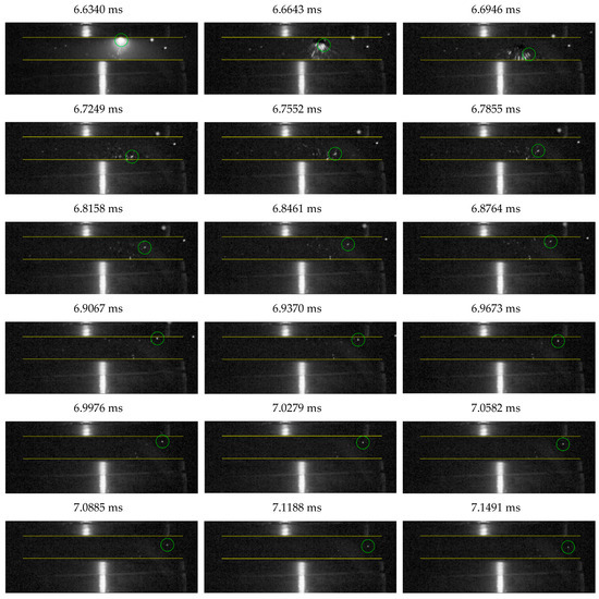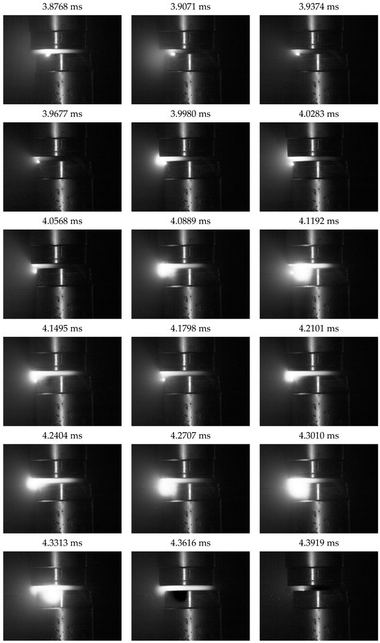 Figure 13 provides a time-lapse analysis of a selected part of the vacuum arc burning process, corresponding to the characteristics shown in Figure 12. At t = 3.7859 ms, a significant flash due to arc burning between the contacts becomes visible in the contact gap. This corresponds to the voltage rise of the vacuum arc at t1 in Figure 12. Subsequent frames clearly show repeated intense flashes, which diminish after approximately 0.7 ms. This reduction is associated with a voltage drop in the burning arc and the transition to a stable burning phase.