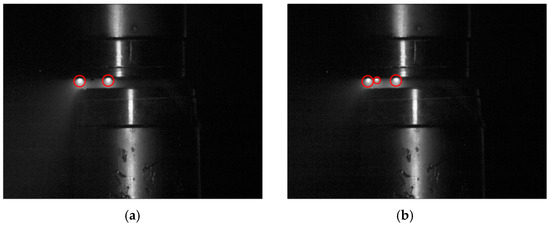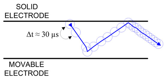 The movement of microparticles detaching from the contact surfaces was analyzed, as shown in Figure 17. Microparticles were observed to move in two ways: bouncing off the electrodes or attaching to one of them. Figure 18 illustrates the detailed movement of a single microparticle.