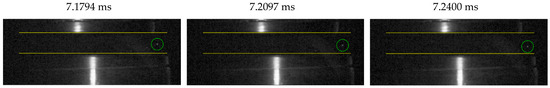 Based on the figure above, three phases of microparticle movement can be distinguished. In the first phase, the microparticle detachment of the stationary contact moves toward the moving contact. In the second phase, it bounces off the moving contact and returns toward the stationary contact. In the last phase, it bounces again from the stationary contact and is detached into the space of the discharge chamber. It should be noted that in the first phase, the microparticle moves at the highest speed, as the microparticle has traveled the longest distance between measurements, with a time of about 30 µs between them. In the second phase, a decrease in the speed of the microparticle is apparent, and in the last phase, the microparticle moves at the lowest speed. This is caused by the loss of kinetic energy after each successive collision with the contact.